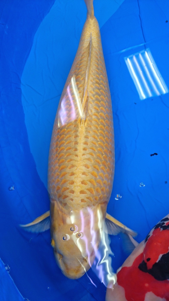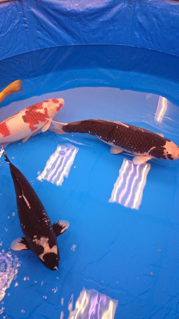 Dvere strážil policajt s mečom,čo dávalo podujatiu patričnú vážnosť. V podstate tam bolo skutočne dosť milionov v bazénoch, podotýkam eur. Výstava je dnes posledný deň, na rybách to aj vidno. Pokožka zvlášť bielych rýb je značne prekrvená, na druhej strane reagujú pokojne a skôr sa pohybujú k návštevníkom,ako od nich. Zrejme sú hladné, teplota vody ide nahor. Prevažuje kohaku sanke,showa,teda silná trojka, dosť je aj shiro,kujaku,goshiki....ale to by som musel vymenovať všetko.Tu treba spomenúť,čo je na rybe najdôležitejším kritériom hodnotenia, je to forma, tvar tela, pri danej veľkosti. K tomu farba, až potom kresba. Prečo sú niektoré ryby šampióni,iné nie? Je veľmi ťažké dochovať rybu nad 80cm, ešte ťažšie je zachovať jej optimálny tvar a prierez tela, mohutnosť, koreň chvosta, následne bezchybné ošupenie, plutvy, kvalitu pokožky, lesk...Farba je u tak veľkých rýb zvlášť problém, jej hustota sa rastom často stráca, vznikajú prázdne miesta, rovnomernosť intenzity po tele, následne kresba, ohraničenie, všetko veci, ktoré takmer nikdy nevyjdú na konkrétnej rybe výborne. Občas sa to podarí, a je z toho šampión. Tieto veci sa pochopia,len keď ich človek vidí skutočne naživo, a práve to bolo zmyslom výstavy pre mňa. Tieto veľké ryby sa často na výstave pri transporte nenávratne poškodia a stratia na cene. Videl som prázdny bazén v ktorom bol kus plutvy. Následne som v bazéne našiel majiteľku-obrovská samica kigoi s amputovanou časťou chvosta, víťaz Kawarimono Jumbo kategorie .Víťazi totiž putujú z pôvodných do nových bazénov na čestné miesto. Zrejme pri prelovení došlo k tomuto úrazu.