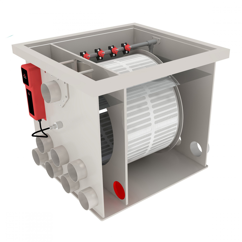 Voda z jazierka preteká cez jemné filtračné sito v rotujúcom bubne, ktoré zachytáva zvyšky krmiva, kal, riasy a ďalšie mechanické nečistoty. Keď sa sito začne zanášať, filter automaticky spustí preplachovací cyklus. Bubon sa otočí a vysokotlakové trysky odstránia zachytené nečistoty do odpadového vývodu. Vďaka tomuto systému je filtrácia jazierka nepretržitá a veľmi efektívna, čo pomáha udržať vodu číru a nezávadnú pre ryby a vodné rastliny.