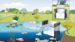 - Plávajúci skimmer s vlastným motorom pre veľké plochy jazierok, až do 250 m2
